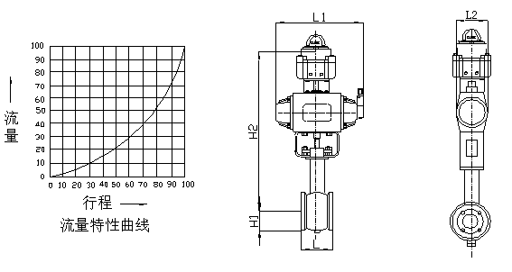 V形球阀密封形式为软密封和硬密封二种。 1.2动作原理: a.气动活塞式执行机构为双作用时: 由双作用定位器输出的气源信号压力分别输入执行机构活塞左、右二气室,由于输入活塞左、右二气室的气源压力不同,形成压差,推动活塞作直线运动。通过齿轮、齿条传动,将活塞的直线运动转换成执行机构主轴的旋转运动,直至左、右气室压力平衡,运动停止。在执行机构作旋转运动的同时带动阀杆、阀芯作旋转运动,以改变阀芯、阀座间的流通面积,达到调节目的。 b.气动活塞式执行机构为单作用时: 由单作用定位器输出的气信号压力输入到执行机构无弹簧一侧的气室中,气信号压力作用在活塞上形成的推力和弹簧力之间差值的作用下,气缸活塞作直线 运动,通过齿轮,齿条传动。直至气信号压力形成的推力与弹簧力平衡,运动停止。在执行机构主轴作旋转运动的同时带动阀杆、阀芯作旋转运动,从而改变阀芯、阀座之间的流通面积,达到调节目的。 结构特点: 1.由于V形球阀流路简单、流阻较小,因而流通能力较大。 2.V形球阀芯上具有近似等百分比流量特性的V形和具有近似线性流量特性的U形二种缺口形式,因而无须通过定位器调整,即能实现不同流量特性的流量控制。 3.可调比可达到300:1,远大于直通单、双座调节阀。 4.具有较高的密封等级,软密封结构的泄漏等级为GB/T4213VI级。硬功夫密封结构的泄漏等级为GB/T4213IV级。 5.正、反作用方式变换较为方便,只需将阀芯初始位置旋转90℃,既能实现作用方式的转换。 6.结构简单、维护方便。体积较小、易于安装。